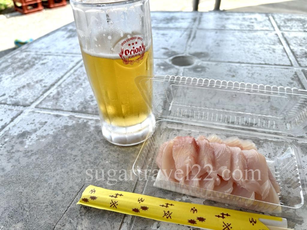空港バスまで少し時間があったので、『マルハ鮮魚』にてお刺身とビールを外のテーブルでいただきます。