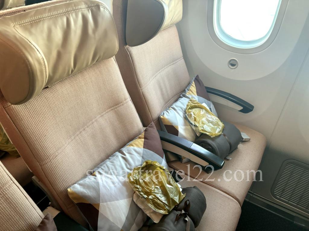 ANAなどに乗り慣れていると意外に思うのですが、海外のエアラインは座席指定が有料であることが多く、エティハド航空も予約時に席を自由に選びたい場合は追加費用が必要でした。しかし、24時間前から始まるオンラインチェックイン時であれば、ある程度座席指定が可能になります。