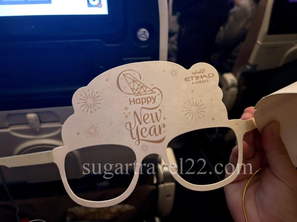 CAさんにより全員にハットとグラスが配られ、0時少し前にアナウンスが入りました。