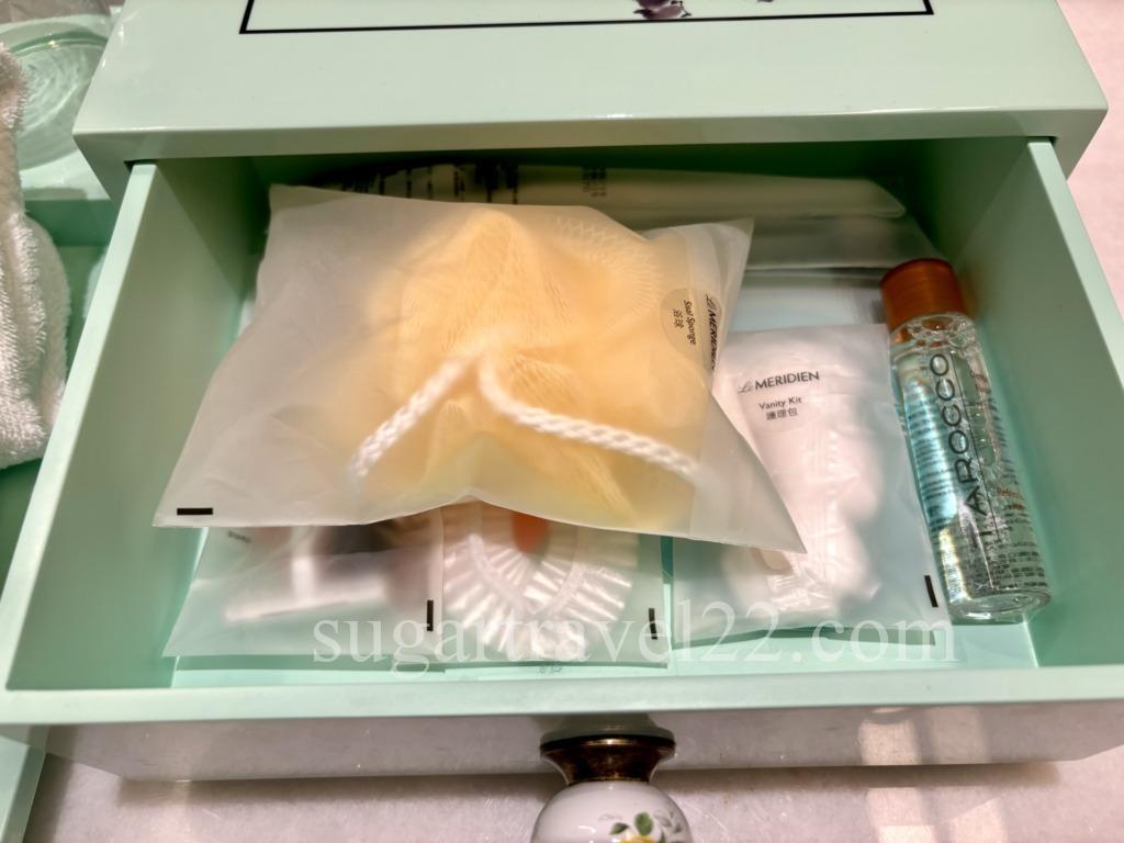 ボディスポンジやシャワーキャップなど基本的なものの他、マウスウォッシュ。