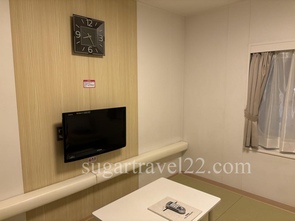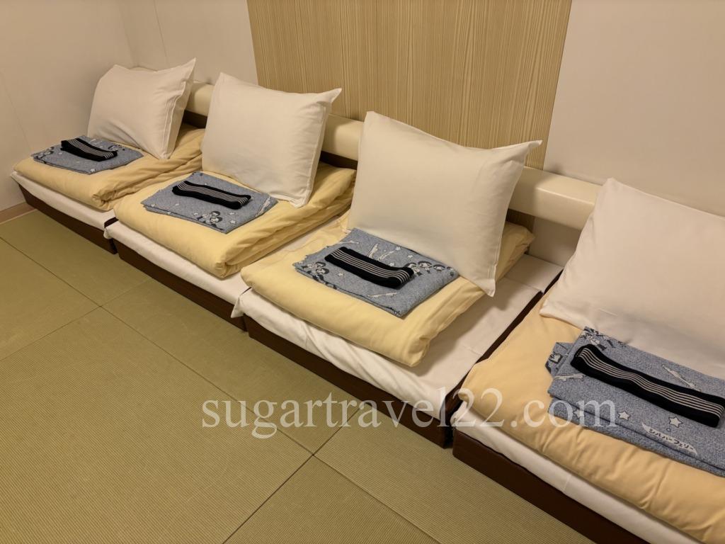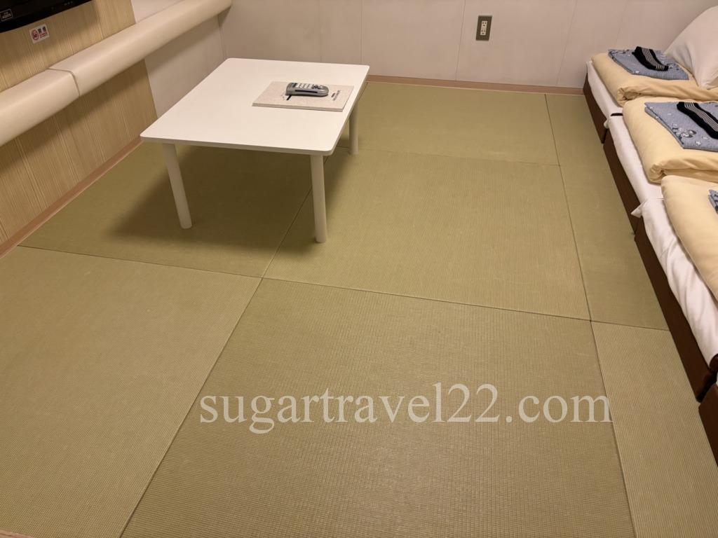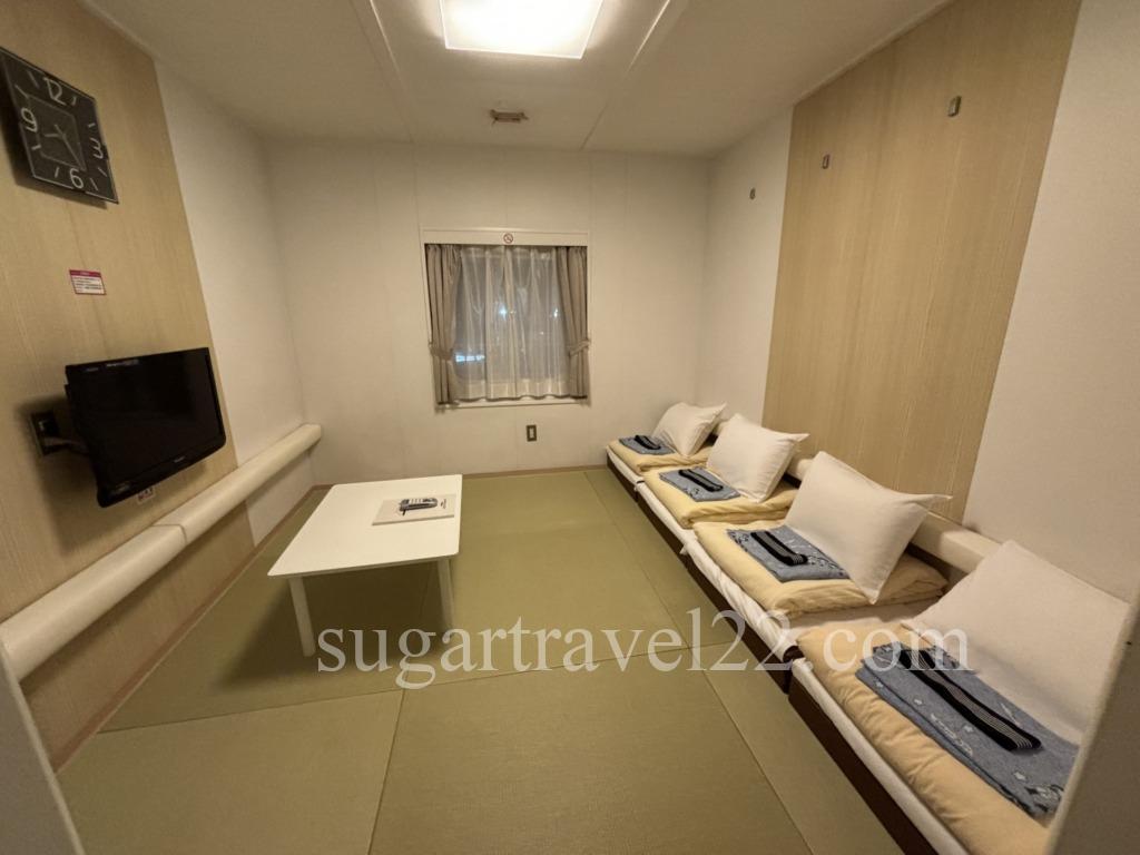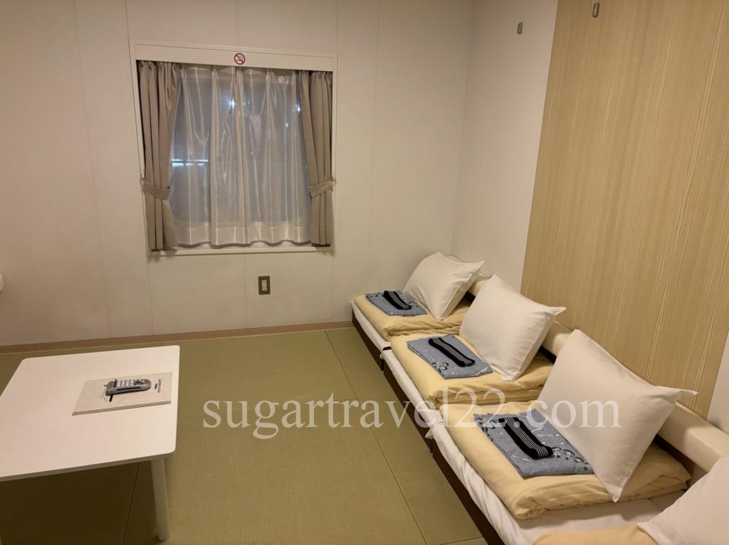 お部屋はこのような感じ。大人4名だと少し狭く感じるかもしれませんが、この時間帯だと寝るだけなので割り切れば問題ないです。子供連れのファミリーにはちょうどいいかもしれません。