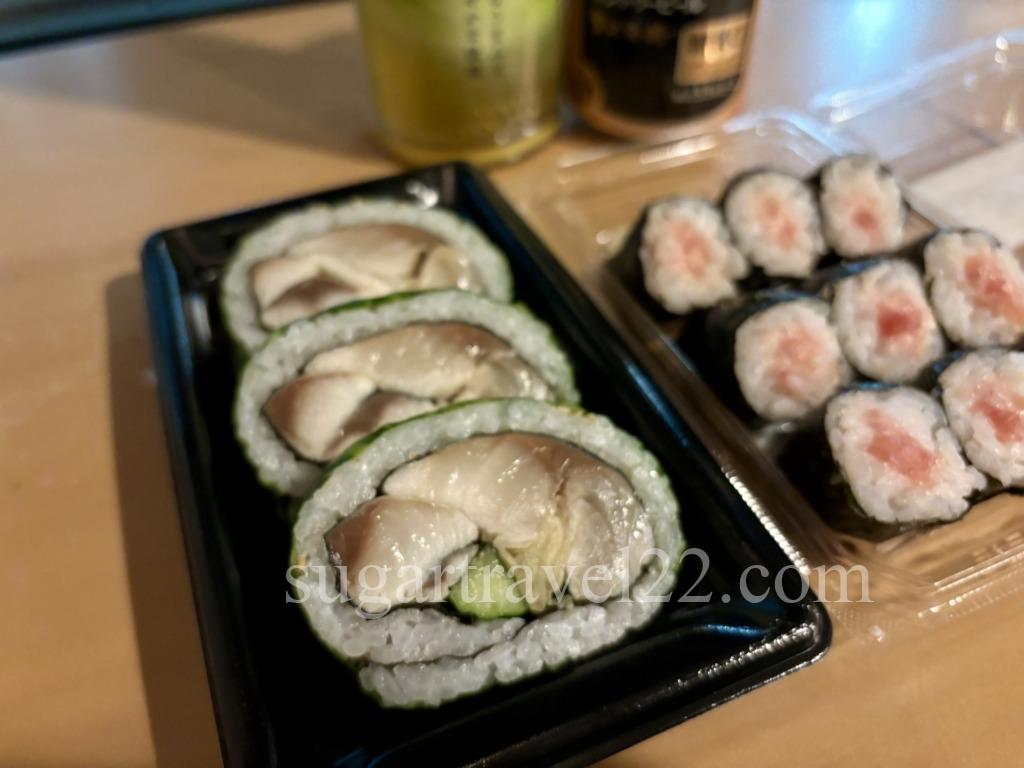 東京駅で買った鯖の巻き寿司とねぎとろで乾杯としました。
