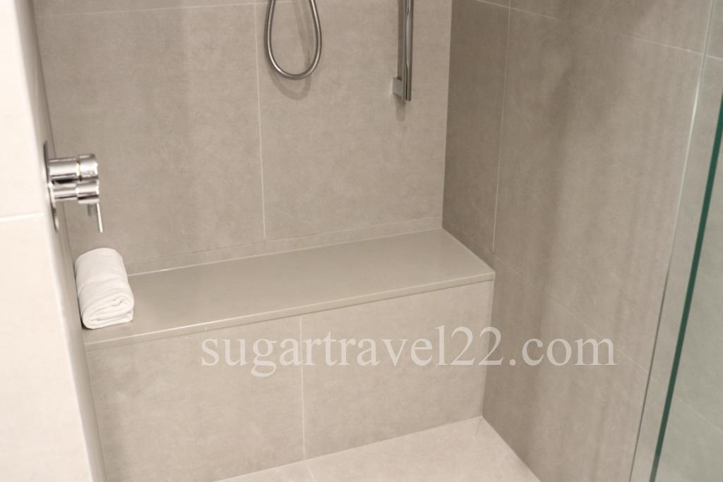 バスタブがないタイプだと、泡だてネットとかボディタオルなどを置く場所がないことが多いので、シャワールーム内に腰掛けるスペースがあるのはポイント高い!